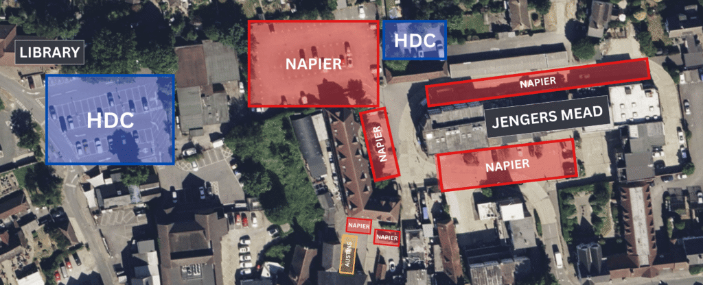 Napier Parking covers the rest of the Jengers Mead car park (marked red on map below) and operate ANPR cameras which allow only 5 minutes to buy a ticket before issuing a fine. We hate to see our customers get fines, so if you are using the Napier car park, please do purchase a ticket promptly using the machines or the Ringo App.